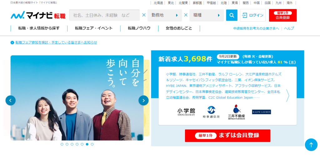 常時8,000件以上の求人情報を掲載しており、約700万人の会員を有する、業界最大級の転職サイト。